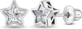 A wonderful gift for a special young girl, these adorable star shaped screw back earrings feature a glimmering simulated birthstone at its center. A classic cubic zirconia stone that will sparkle and shine just as bright as her smile. These beautiful star earrings include safety screw backs, that allow the earrings to remain safely in place. Gift Box included with purchase.