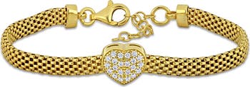 Express your love with our Cubic Zirconia Heart Bangle. This enchanting bangle features a heart design adorned with brilliant cubic zirconia stones. Crafted in yellow-plated sterling silver and measuring 6.5 inches plus 1-inch extender. The combination of the heart motif and the intricate weave design creates a romantic and stylish piece suitable for various occasions. Elevate your wrist with the sparkling allure and heartfelt design, a perfect addition to your jewelry collection.
