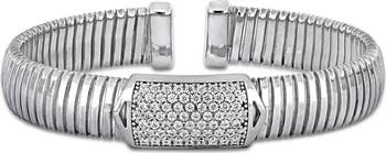 Brilliant cubic zirconia stones form a striking rectangular cluster on a stretch omega bangle in sterling silver and two-tone sterling silver. Its bold yet elegant design adds dimension and style, perfect for layering or wearing as a statement piece. A versatile accessory that brings modern sophistication to any ensemble.
