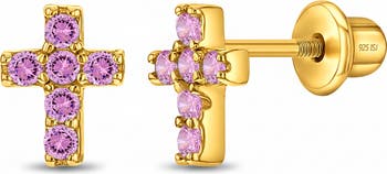 A glimmering pair of cubic zirconia encrusted cross earrings for a special little girl. These cross earrings are the sweetest details for a little girl to wear on her special Day. A pair of religious cross earrings that can be worn to a baptism, first communion or simply just because. Detailed with sparkling cubic zirconia stones, it makes the sweetest detail for a special day. Made from hypoallergenic 14k gold over sterling silver, it is safe for girls with sensitive skin. The safety screw back closures make it easy for earrings to remain safely in place. Arrives in a gift box for easy gifting.