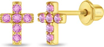 A glimmering pair of cubic zirconia encrusted cross earrings for a special little girl. These cross earrings are the sweetest details for a little girl to wear on her special Day. A pair of religious cross earrings that can be worn to a baptism, first communion or simply just because. Detailed with sparkling cubic zirconia stones, it makes the sweetest detail for a special day. Made from hypoallergenic 14k gold over sterling silver, it is safe for girls with sensitive skin. The safety screw back closures make it easy for earrings to remain safely in place. Arrives in a gift box for easy gifting.
