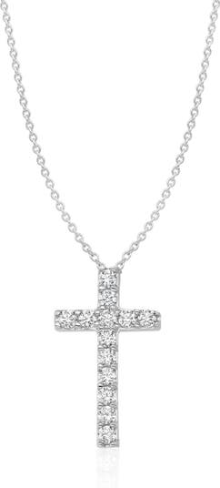 Hand-set round cubic zirconia illuminate this hypoallergenic cross pendant necklace crafted from sterling silver and plated in polished platinum.