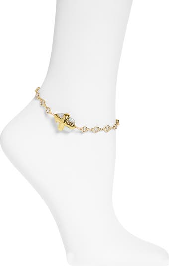 Cubic zirconia bezels sparkle all around this glamorous anklet with a freshwater pearl and cross at the focal point.