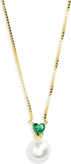 A verdant cubic zirconia heart tops a faux pearl on this sterling silver necklace plated in 18-karat gold.