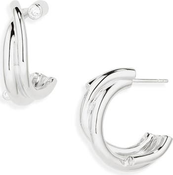 Bezel-set cubic zirconia punctuate the layered, twisting silhouette of these high-polish hoops.