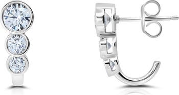 Graduated cubic zirconia hand set in circular bezels shape these sterling silver hoop earrings.