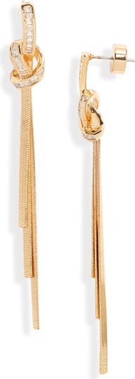 Baguette-cut cubic zirconia sparkle from artfully twisted knots on these cascading snake-chain drop earrings layered in warm 14-karat yellow gold.