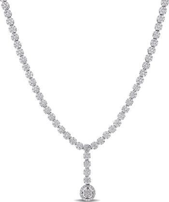 This eye-catching cubic zirconia floral cluster lariat necklace is crafted in lustrous sterling silver and features round-cut, prong-set cubic zirconia stones in a unique flower cluster Y-necklace design. A trendsetting opulent look at a price to love, this exquisite cubic zirconia necklace is sure to make a standout addition to any jewelry collection.