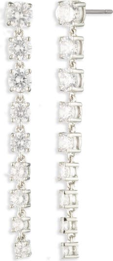 Cubic zirconia crystals cascade in a sleek, elongated line on these luminous drop earrings that sparkle with timeless appeal.