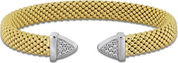 Cubic zirconia stones add a touch of shimmer to this open popcorn-style stretch bangle in two-tone yellow and white sterling silver. Its playful yet refined design makes it perfect for layering or wearing alone. A versatile piece that brings contemporary elegance and subtle sparkle to any look.