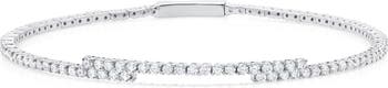 A line of hand-set cubic zirconia regally sits atop and adorns the curves of this sparkling bangle designed to make a stunning statement on your wrist.