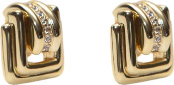 A stream of pavé cubic zirconia curve along these square sterling silver stud earrings plated in gleaming 18-karat gold.