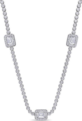 This trendsetting multi-cut cubic zirconia station necklace is crafted in lustrous sterling silver and showcases round-cut cubic zirconia gemstones along with seven emerald-cut cubic zirconia gemstone in a stunning and unique stationed necklace design. Polished to a brilliant shine, this alluring and bold station necklace is the perfect addition to any jewelry collection. Deck your neck with this captivating design and instantly add a touch of elegance and sophistication to your look.