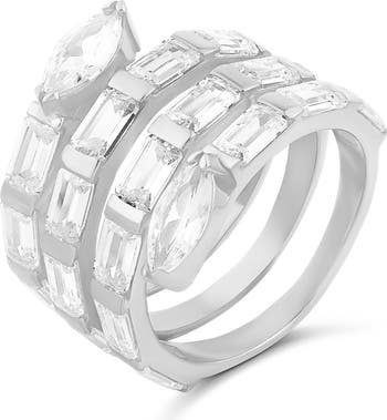 Baguette and marquise cubic zirconia sparkle atop a swirling bypass ring elegantly crafted from 14-karat gold-plated or rhodium-plated sterling silver.