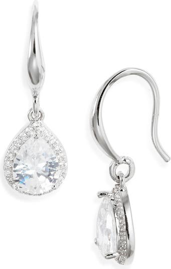 Pear-cut cubic zirconia haloed with pavé crystals brings captivating sparkle to dainty earrings perfect for everyday wear.