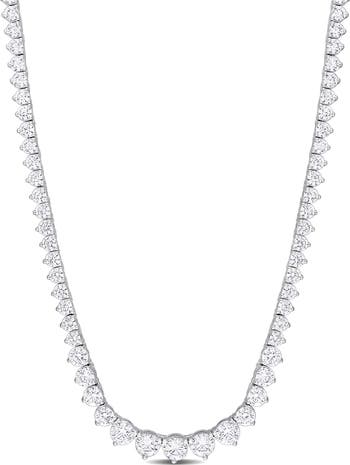 This shimmering cubic zirconia tennis necklace is crafted in lustrous sterling silver and features a total of 127 round-cut, prong-set cubic zirconia stones in a classic full-eternity tennis necklace design. A sumptuous look at a price to love, this exquisite cubic zirconia necklace is sure to make a standout addition to any jewelry collection.