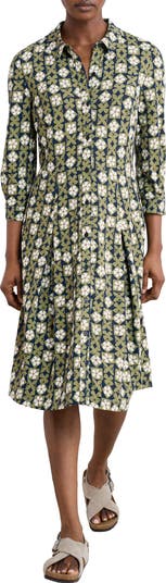 Sharp skirt pleats enhance the flared silhouette of this polished shirtdress sweetened by a fanciful flowery print.