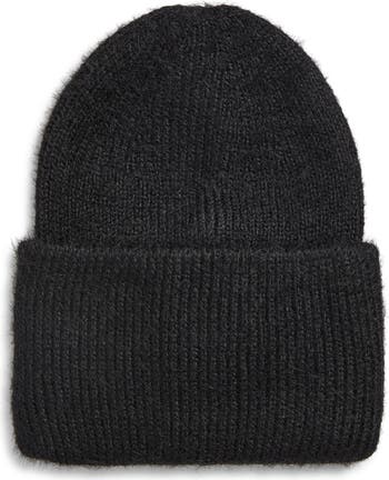 Brave the chill in this fuzzy textured beanie knit with a cozy cuff.