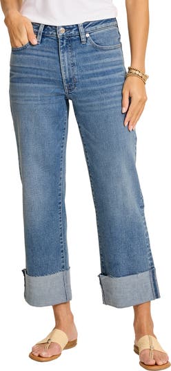 Rock a casual-chic look in these high-waist, low-stretch jeans made with full-length straight legs that feature raw hems and can be cuffed to an abbreviated length.