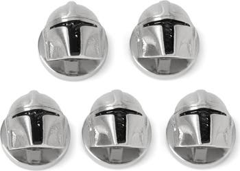 This set of 3D studs feature Mando's helmet set in shiny silvertone stainless steel. The fixed backing features a debossed mythosaur skull on the reverse side. They are built to withstand the challenges of bounty hunting across the galaxy, infused with the honor of Mandalorian creed and ready to accompany you on interstellar hunts.