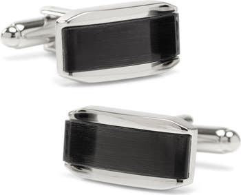 Sleek cat's eye inlays elevate charming cuff links with a bright rhodium-plated sheen.