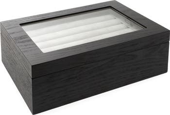 Protect and display your cuff links and tie clasps in this handsome wooden case with two layers of storage and a soft interior lining.