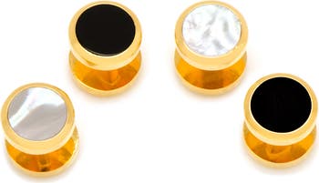 Onyx and mother-of-pearl inlays define reversible shirt studs with a rich goldtone sheen.