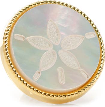 An etched rim encircles a luminous mother-of-pearl inset with a sand dollar design creating a refined lapel pin that complements any ensemble.