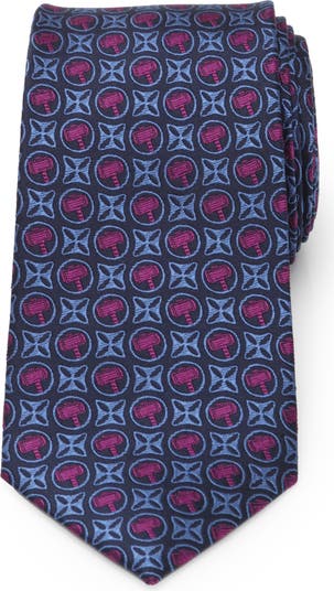 The superhero Thor throws his hammer into the neat medallions patterning a tie crafted from soft, polished silk to save a universe of outfits.