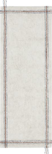 Tufted cotton-blend pile creates subtle texture on a washable rug styled with contrast color lines and braided tassels.