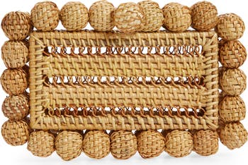 Cult Gaia makes accessorizing an art form with this rattan box clutch framed by bold sculptural baubles.