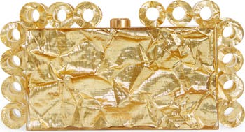 Chic style will be at your fingers with this statement-making clutch adorned with metallic fabric and circular details lining the edges for a standout look.