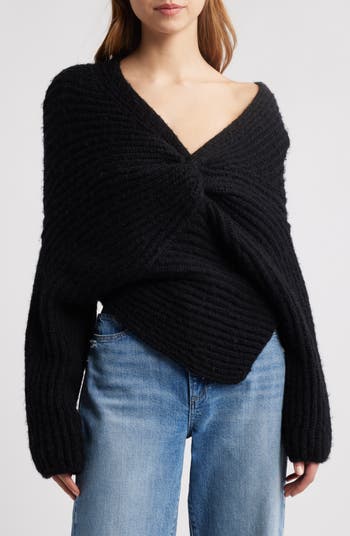 A twisted front brings graceful drape to this wool-blend sweater designed to be slung off one shoulder.