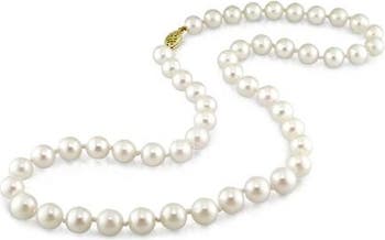 Experience timeless luxury with this cultured Akoya pearl strand necklace, featuring exceptional luster and quality. The 18-inch strand is elegantly secured with a 14K yellow gold beaded fisheye clasp, adding a touch of warmth and sophistication. Perfect for formal occasions or elevating everyday style. A classic statement piece that exudes grace and refinement.