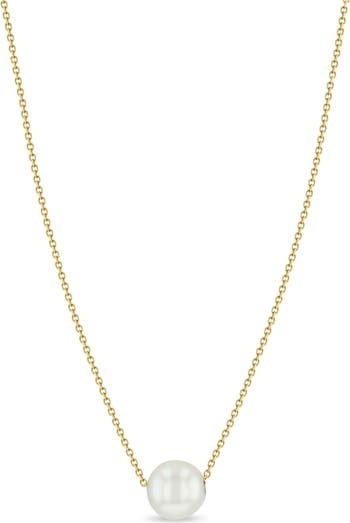 A delicate chain crafted from 14-karat gold is centered by a lustrous cultured pearl that sits prettily at the base of your throat.