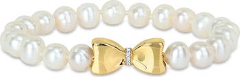 This pearl strand bracelet is crafted in lustrous 10k yellow gold. This simple and delicate bracelet showcases a string of round freshwater cultured pearls with a central bow design motif studded with 10 round pave-set diamonds. Enhanced with a polished finish, this classic bracelet measures 7.5-inches in length.