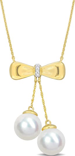 This elegant bow tie drop necklace features lustrous cultured pearls, adorned by diamond accents, beautifully crafted in 10k yellow gold. With its classic design and the interplay of pearls and diamond accents, this necklace is complete with an 18-inch cable chain and secured with a spring ring clasp.