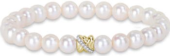 This vintage pearl strand bracelet is crafted in lustrous 14k two-tone white and yellow gold. This simple and delicate bracelet showcases a string of round-shaped, freshwater cultured pearls with a small central crossover motif studded with 20 round prong-set diamonds. Enhanced with a polished finish, this classic bracelet measures 7.5-inches in length.