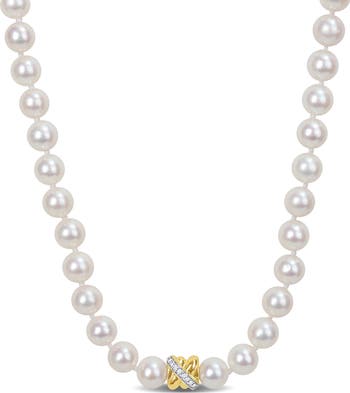 This vintage pearl string necklace is crafted in lustrous 14k yellow and white gold. This elegant necklace showcases a string of round-shaped, white freshwater cultured pearls with a small central crossover motif studded with 20 round-cut, prong-set diamonds. Enhanced with a polished finish, this classic necklace measures 17-inches in length and is secured with a lobster clasp. Coordinate this exceptional necklace with a pair of pearl studs for a flawless ensemble.