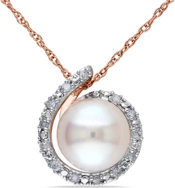 This elegant necklace features a freshwater round white pearl surrounded by a halo of round diamonds set in 10-karat rose gold. This brilliant pendant is hung on a rope chain and is secured with a spring ring clasp.
