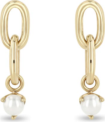 Cultured pearls make glowing anchors for high-polish drop earrings crafted from 14-karat gold.