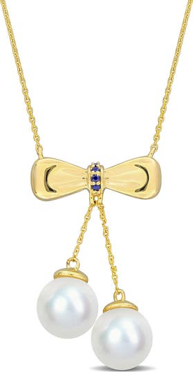 This elegant bow tie drop necklace features lustrous white freshwater cultured pearls, adorned by gemstone accents, beautifully crafted in 10k yellow gold. With its classic design and the interplay of pearls and gemstone accents, this necklace is complete with an 18-inch cable chain and secured with a spring ring clasp. Offer a harmonious blend of charm and color for various occasions.