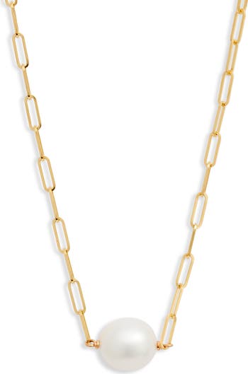 A glossy cultured pearl is supported on a paper-clip chain in this minimalist pendant necklace handmade from 14-karat gold.