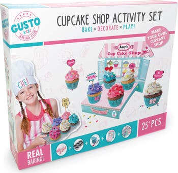 NEW! GUSTO Cupcake Shop Activity Set. A great way to combine REAL BAKING with decorating and playing, all in one box! This activity set contains all the tools you need to start your own Cupcake Shop. REAL cookware specially developed for kids in combination with a Decorate-your-own cardboard Cupcake Shop Stand. Contents: Non-stick Cupcake Tray, Piping bag with nozzles, Silicone Spoon, Silicone Spatula, 50 paper printed cupcakes, Foldable Cardboard Cupcake Shop Stand, Sticker Set and a Recipe Leaflet. With our activity sets we want to inspire kids to bake and cook!