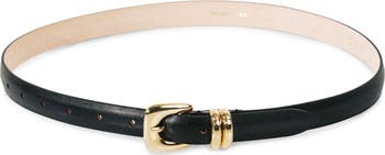 Curved goldtone hardware shaped in a Cupid motif brings sculptural shine to this slender leather belt crafted in supple leather.