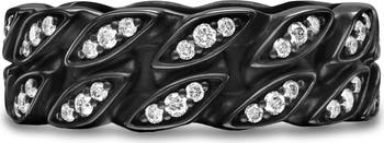 Trios of pavé diamonds station the chain-inspired silhouette of this handsome ring crafted from black titanium.