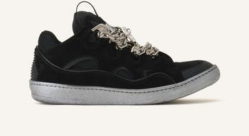 The Curb sneaker embodies the vibrant spirit of the 90s, with its bold, oversized silhouette. It embodies several of the House's signatures: Contrast, with a variety of materials, textures and colors. The ribbon, which represented the bond between a mother and daughter for Jeanne Lanvin, with oversized laces made in Greece, double waxed and featuring a chevron motif. And finally, the Circle, with rounded lines, an architectural detail inspired by Art Deco. This season, the Studio offers a new version, the Curb Chaîne, which revisits the monochrome black model with metal chain-effect laces.