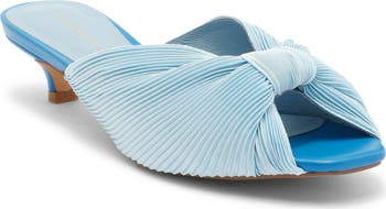 Pleated satin twists into an elegant knot on this square-toe slide sandal lifted by a low kitten heel and cushioned with comfy memory foam.