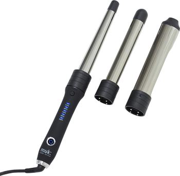 The ultimate styling tool for all hair types, the muk Curl Stick is designed to create long lasting curls, any shape or style you desire. With 3 interchangeable barrels in various sizes, the curling options are limitless. Each barrel is finished in smooth titanium providing instant results of static free curls and shine.