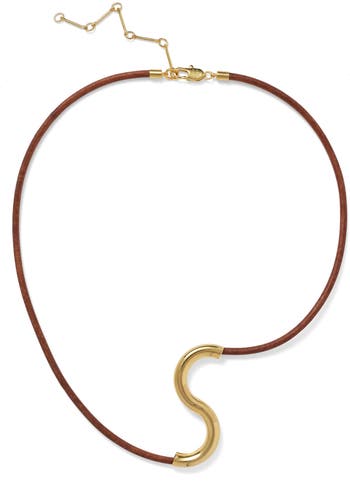 An S-shaped bar puts a scuptural twist and wink of light in this leather cord necklace.